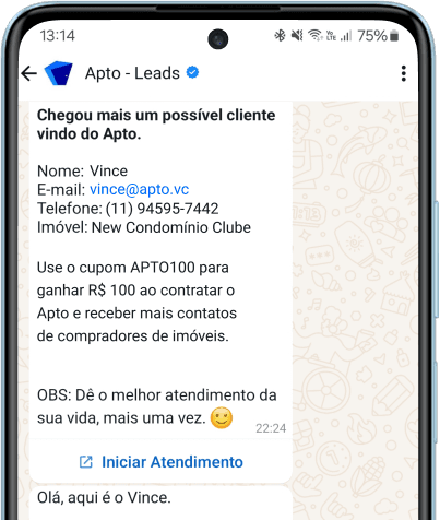 Por meio de um formulário com nome, e-mail e telefone, os corretores de imóveis recebem esses dados do cliente para seguir com o atendimento. No Apto, sempre enviamos os leads via WhatsApp e por e-mail.